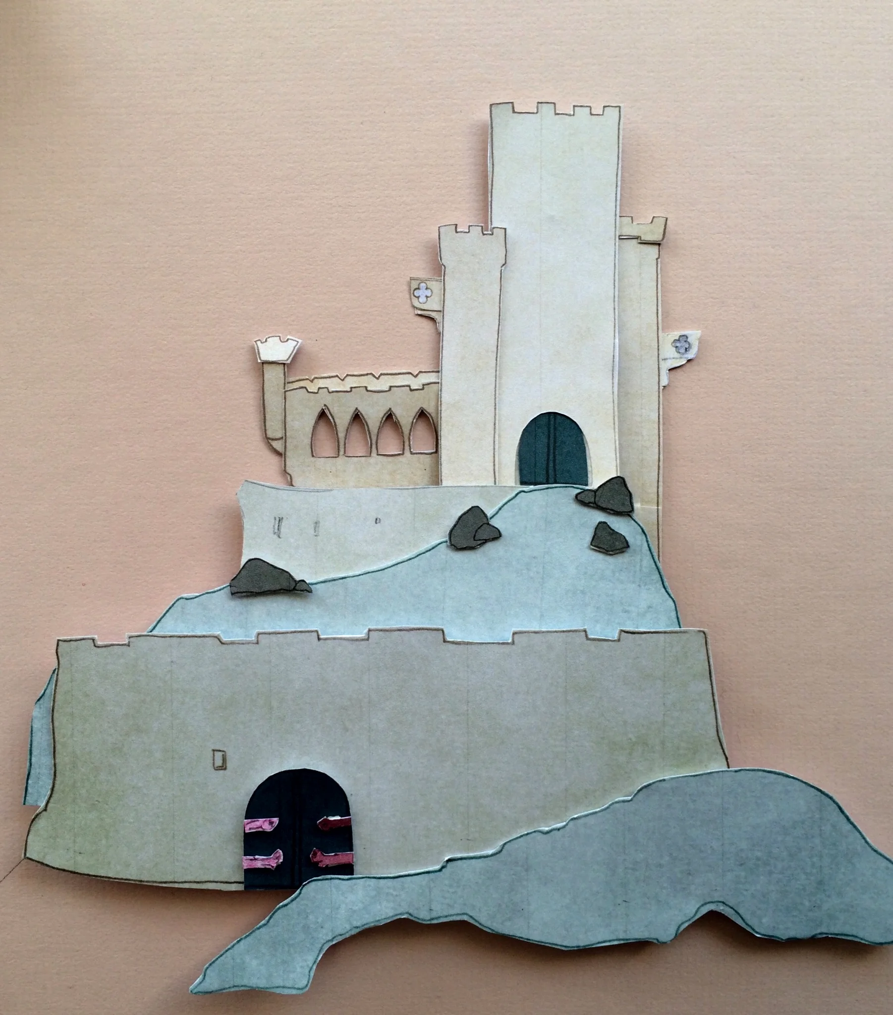 We are drawing on Eleanor's past experience in set building and she has been busy constructing fabulous scenery based on our discussions of the storyboards. As well as constructing the sets in miniature for real, she also places them in the virtual realm of the computer as well. This is where she can begin to work out what elements are needed where for our camera work and whether we need any more scenery bits to cover certain angles. We are building each scene up in layers and are finding there are plenty of opportunities to play around with the way the layers interact with each other. Building the sets for real out of card is so useful when it comes to discussions about what might need to be added or changed.